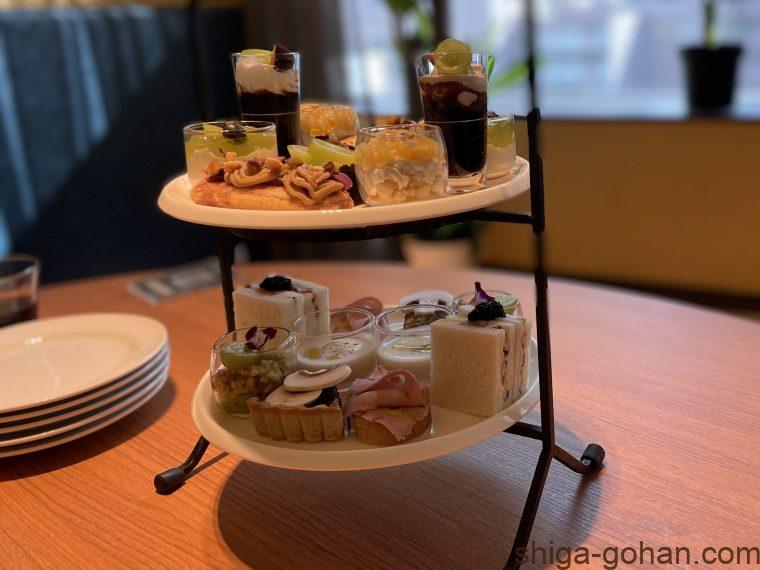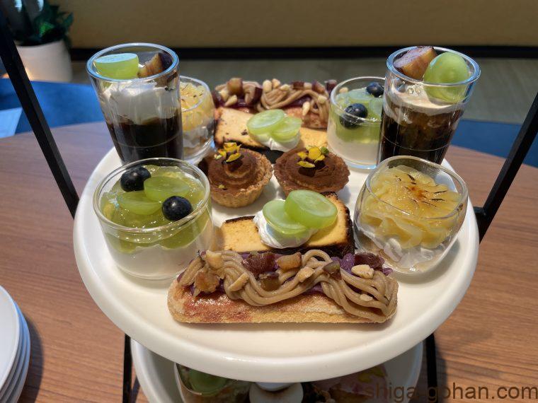 こちらがアフタヌーンティの上の段で、シャインマスカットや栗、さつまいもを使ったスイーツ系が乗っています。