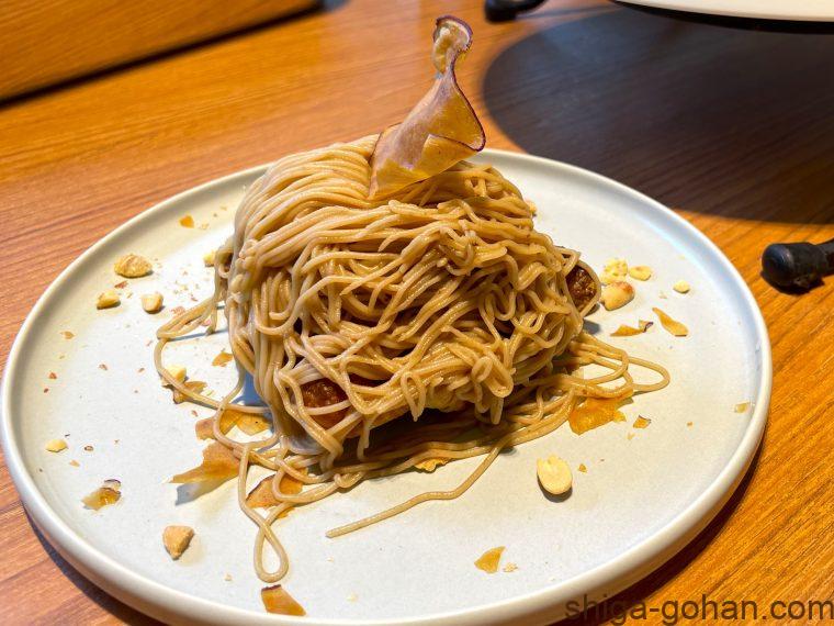 こちらがメインのスイーツの絞りたてモンブランのクロッフル さつまいもチップ添えです。