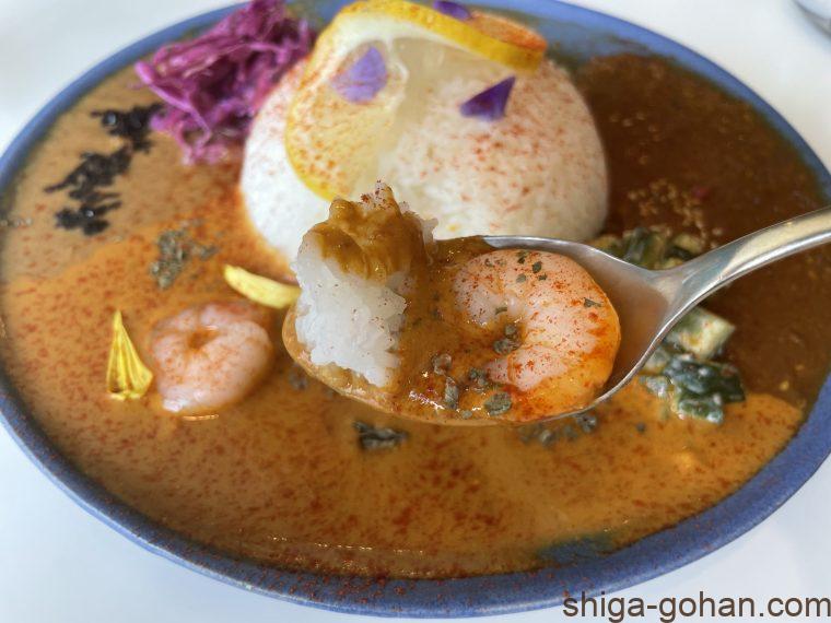大きなエビが2つ乗ったココナッツミルクベースのカリー - 担々カリー